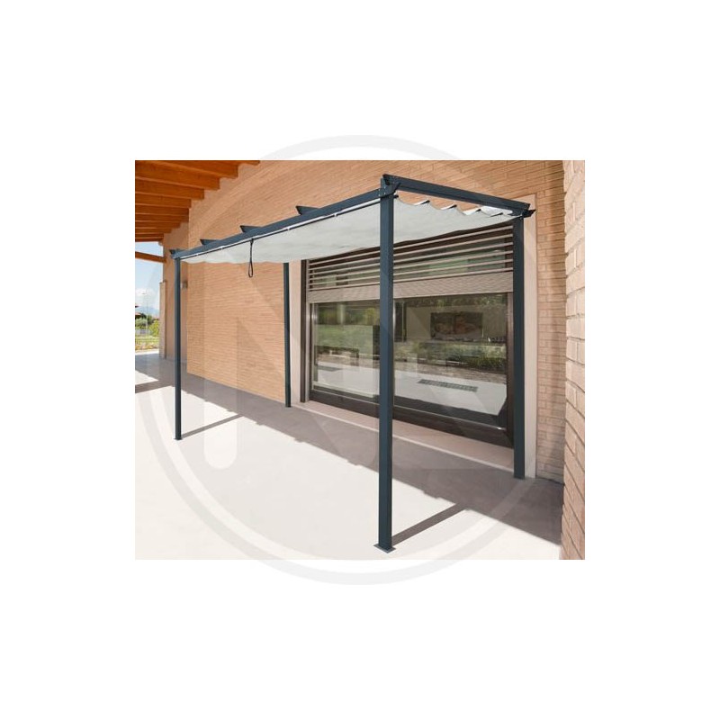 Struttura in acciaio verniciato, colore grigio antracite - 4 pali d'appoggio 8x8 cm. - 5 pali sostegno metallico 30x60 mm. - Copertura scorrevole in polyestere da 260 gr./mq. colore beige